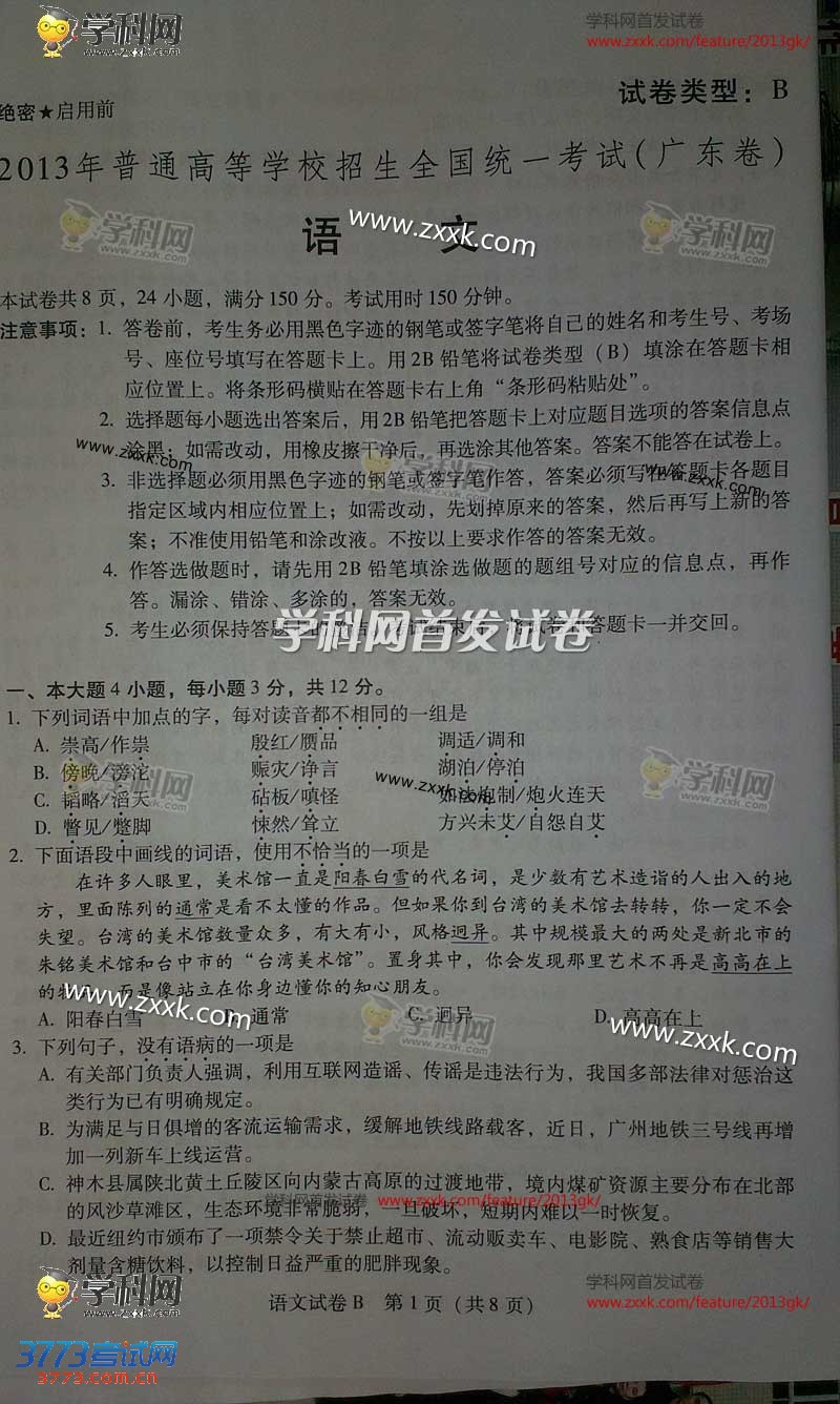 2013广东高考答卷切勿使用网络语言