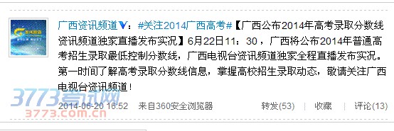广西资讯频道:#关注2014广西高考#【广西公布2014年高考录取分数线 资讯频道独家直播发布实况】6月22日11:30 ,广西将公布2014年普通高考招生录取最低控制分数线,广西电视台资讯频道独家全程直播发布实况。第一时间了解高考录取分数线信息,掌握高校招生录取动态,敬请关注广西电视台资讯频道!