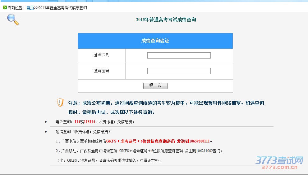 2015年广西高考成绩查询入口1:广西招生考试网查询: