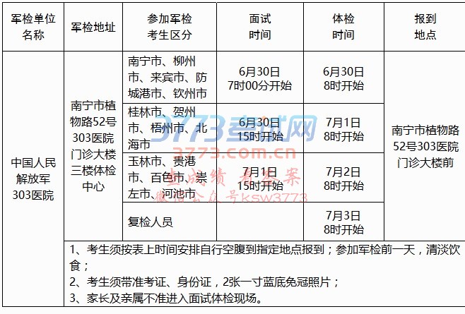 中国人民解放军303医院南宁市植物路52号303医院门诊大楼三楼体检中心南宁市、柳州市、来宾市、防城港市、钦州市6月30日