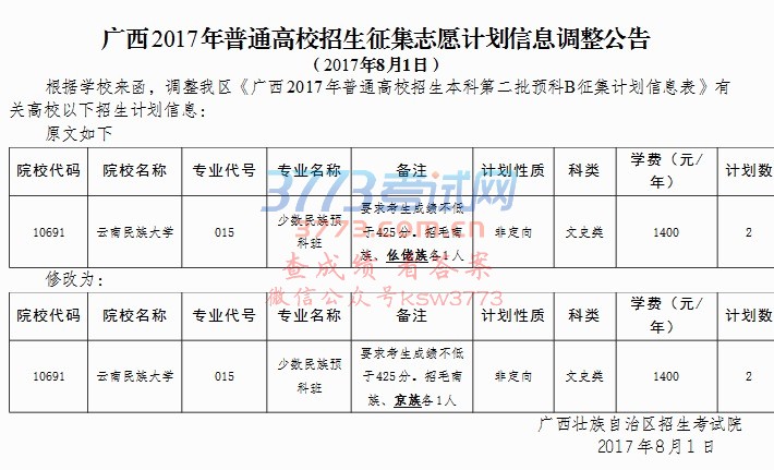 广西2017年普通高校招生征集志愿计划信息调整公告