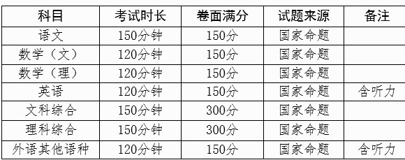 我区普通高考全国统考各科目均采用教育部命制的试题。全国统考各科考试时长及赋分如下: