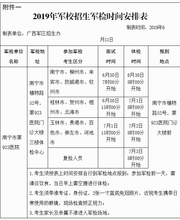 1.考生须按表上时间安排自行到军检地点报到;参加军检前一天,需清淡饮食,当日早上需空腹进行体检;