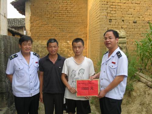 图为融安县国税局领导将1000元捐款送到贫困生郭双胜家中。