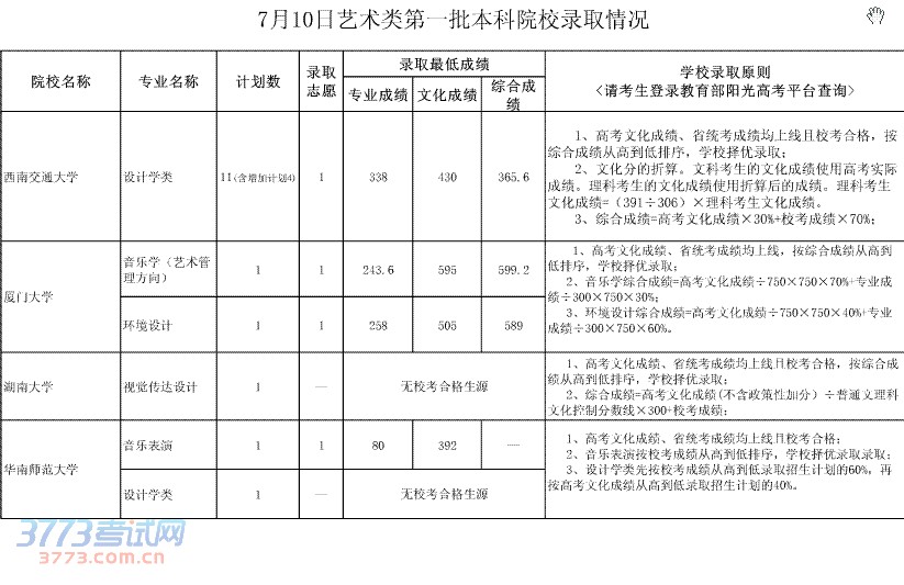 7月10日艺术类第一批本科院校录取情况