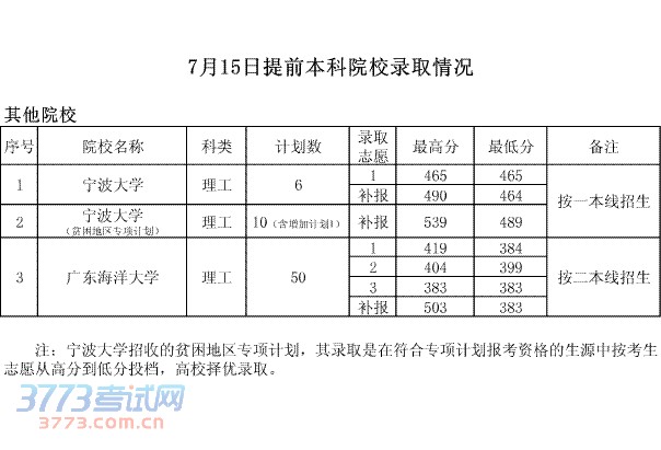 7月15日提前本科院校录取情况