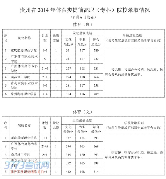 贵州省2014年体育类提前高职(专科)院校录取情况(8月6日发布)