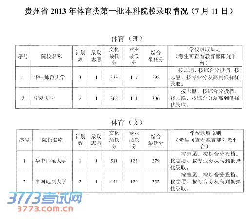 贵州省2013年体育类第一批本科院校录取情况(7月11日)