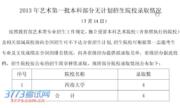2013年艺术第一批本科部分无计划招生院校录取情况(7月14日)
