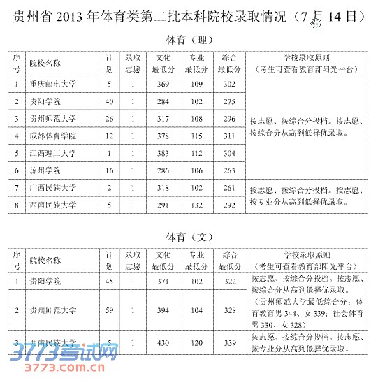 贵州省2013年体育类一本院校录取分数线(7月13日)