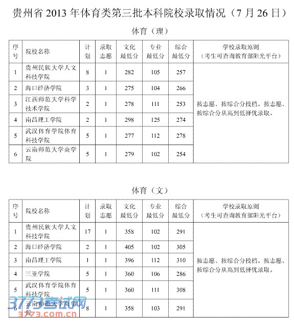 贵州省2013年体育类第三批本科院校录取情况(7月26日)