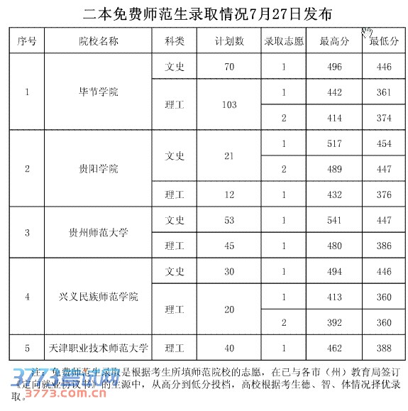 2013年7月27日贵州高考二本免费师范生录取分数线