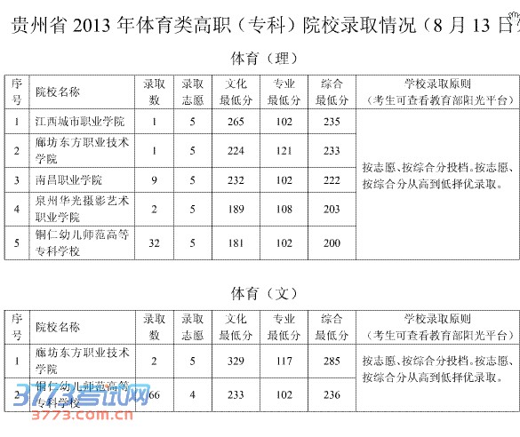 贵州省2013年体育类高职(专科)院校录取情况(8月13日)