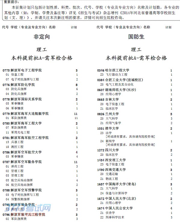 三、本征集计划只包括计划性质、科类、批次、代号、学校(专业及专业方向)名称及计划数,各专业的其他内容(如:学制、学费及备注等)详见《考试与招生》杂志增刊《2014年河北省普通高等学校招生计划(文、理)》,另请关注本次新注明的要求,详情可向招生院校咨询。