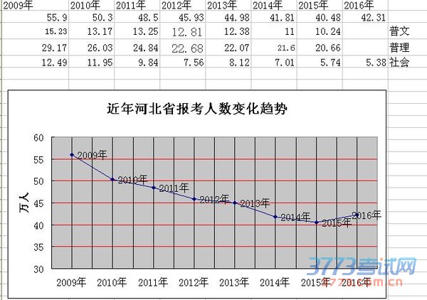 据河北省教育考试院消息:河北省2016年普通高考报名工作已经结束。报名人数为42.31万人,比2015年增加1.83万人,是连续7年下降以来的首次回升。其中统考39.22万人,对口类2.66万人,只参加各种单独招生的0.43万人。按是否应届考生统计:应届考生36.93万人,社会考生5.38万人。