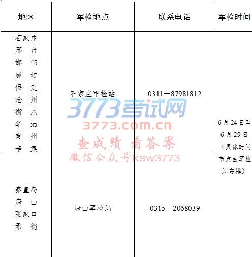 附件1河北省2017年军队院校招收普通高中毕业生军检安排表地区 军检地点 联系电话 军检时间石家庄邢 台邯 郸廊 坊保 定沧 州衡 水华 油定 州辛 集 石家庄军检站 0311-87981812 6月24日至6月29日(具体时间节点由军检站安排)秦皇岛唐 山张家口承 德 唐山军检站 0315-2068039 备注:地区按考生高考报名地进行划分。