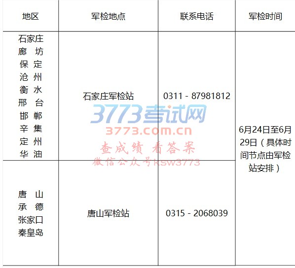 1.6月24日9时,考生可从河北省教育考试院网站(http://www. hebeea.edu.cn)查询是否列入军检范围(查询方法:主页右侧导航栏/普通高考信息服务/军检面试考生查询),也可通过县级招生办公室、军分区、人武部及相关中学查询。