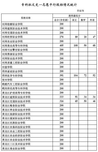 河北省2012年高招专科批文史类一志愿平行投档情况统计