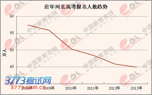 中国教育在线河北地区高考志愿填报指南数据显示,2008年河北高考报名人数有57.48万人,创历史新高,之后几年开始急剧下降。2009年有55.9万人,2010年有50.3万人,2011年有48.5万人,2012年有45.9万人。