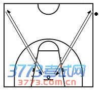 测试方法:以篮圈中心投影点为圆心,以该点至罚球线的距离为半径,画一圆弧(见图2)。考生投篮开始同时开表,考生投篮抢篮板后运球至弧线外A、B、C任意一点再投篮,如此反复一分钟。男子必须跳起投篮,女子可采用原地投篮。