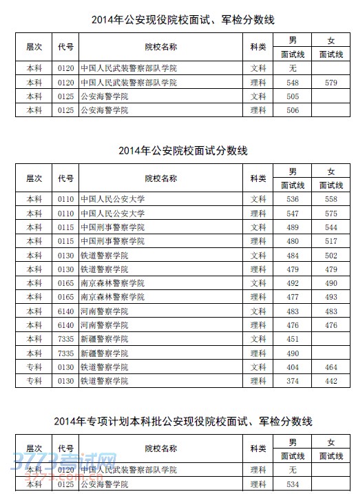 2014年河南省普通高招公安及公安现役院校面试分数线