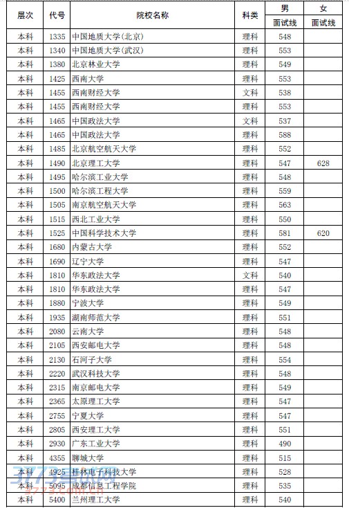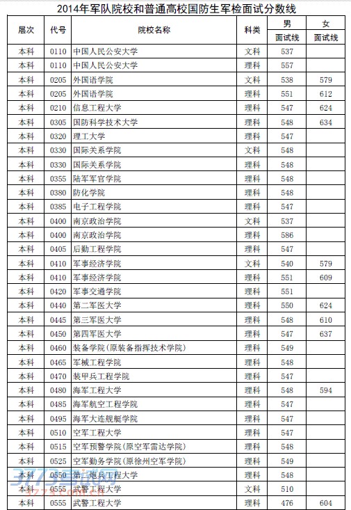 2014年河南省普通高招军队院校和普通高校国防生军检面试分数线