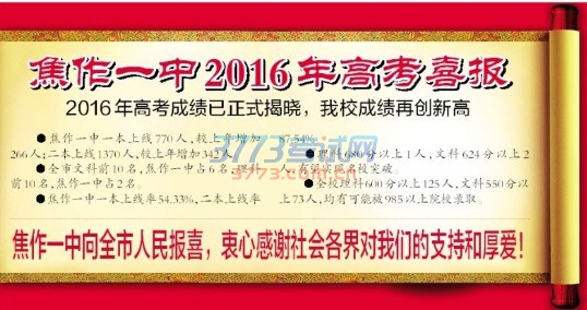 向取得优异成绩的2016届全体师生表示热烈祝贺!感谢全体教职员工的辛勤付出!感谢各级领导和社会各界长期以来对焦作一中的信任与支持!