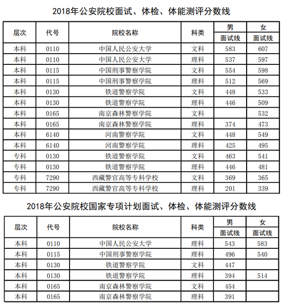 根据河南省公安厅政治部、河南省招生办公室《关于做好2018年公安普通高等院校招生工作的通知》(豫公政〔2018〕130号)文件要求,现将河南省2018年公安院校招生面试、体检、体能测评分数线公布。