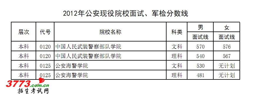 2012年河南公安现役院校面试、军检分数线