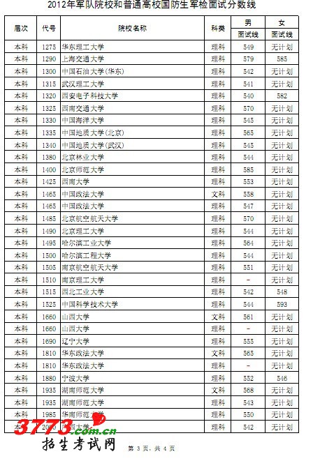2012年河南军队院校和普通高校国防生军检面试分数线