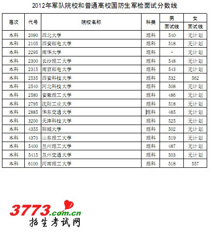 2012年河南军队院校和普通高校国防生军检面试分数线