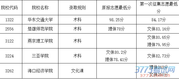 院校代码院校名称录取规则原报志愿最低分第一次征集志愿最低分1322华东交通大学术科98.25分84.17分2556楚雄师范学院术科理体78分文体83.16分3122燕京理工学院术科 文体80.65分理体79.95分3224三亚学院术科文体80.2分理体78.41分文体82.73分3262海口经济学院文化课 理体263分文体250分