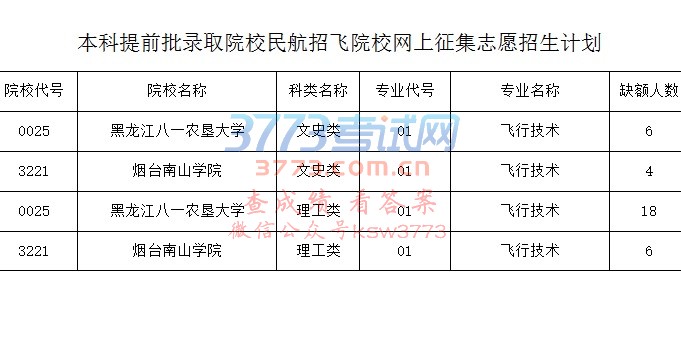 院校代号 院校名称 科类名称 专业代号 专业名称 缺额人数 0025 黑龙江八一农垦大学 文史类 01 飞行技术 6 3221 烟台南山学院 文史类 01 飞行技术 4 0025 黑龙江八一农垦大学 理工类 01 飞行技术 18 3221 烟台南山学院 理工类 01 飞行技术 6