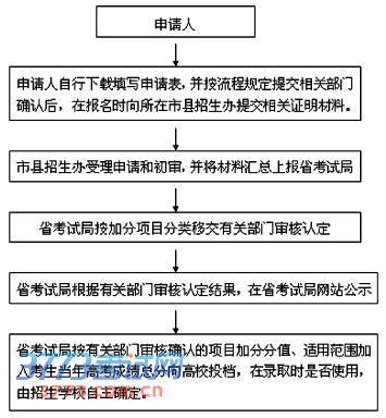 根据海南省普通高等学校考试招生考生享有政策加分确认工作办理流程图,申请人自行下载填写申请表,并按流程规定提交相关部门确认后,在报名时间向所在市县招生办提交相关证明材料。接下来由市县招生办受理申请和初审,并将材料汇总上报省考试局,省考试局按加分项目分类移交有关部门审核认定并在网站上公示审核认定结果。最后,省考试局按有关部门审核确认的项目加分分值、适用范围加入考生当年高考成绩总分向高校投档,在录取时是否使用,由招生学校自主决定。