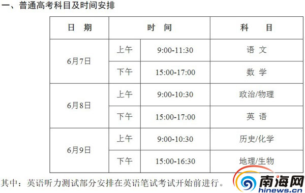 获悉,海南省2014年普通高考于6月7日至9日进行。其中,英语听力测试部分安排在英语笔试考试开始前进行。