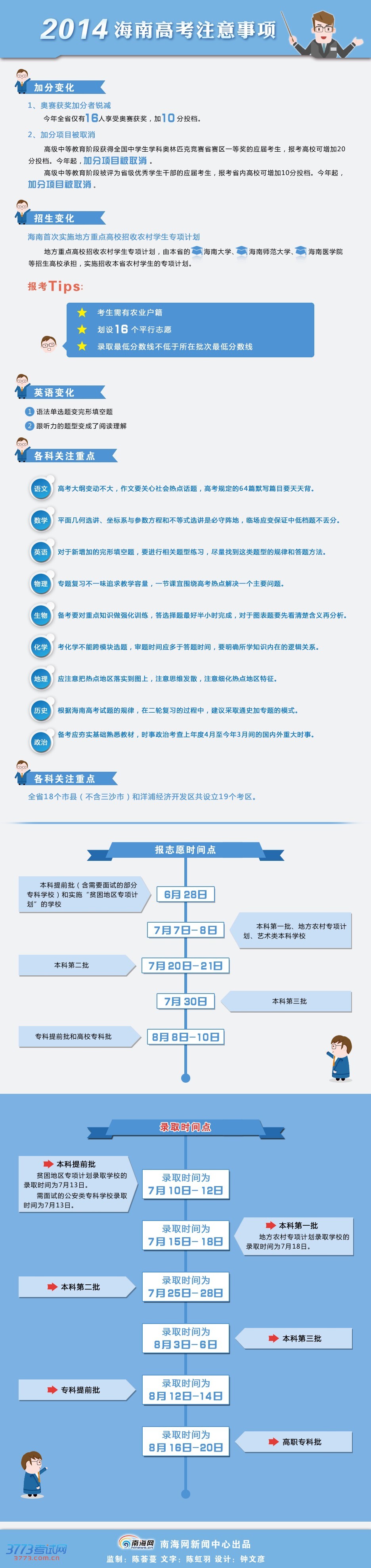高考倒计时已不到1个月了,2014年海南高考有哪些注意事项?在加分、招生、英语方面有哪些变化?考生和家长们都清楚了么?南海网新闻中心为考生和家长们提供了2014年海南考高注意事项图解,让大家一目了然今年海南高考新政策、新变化,并例举各科考试前关注重点,以及报考时间点提示,给考生和家长提供高考便捷的,明了的考试、报考资料,为大家解除考试本身之外的疑惑。