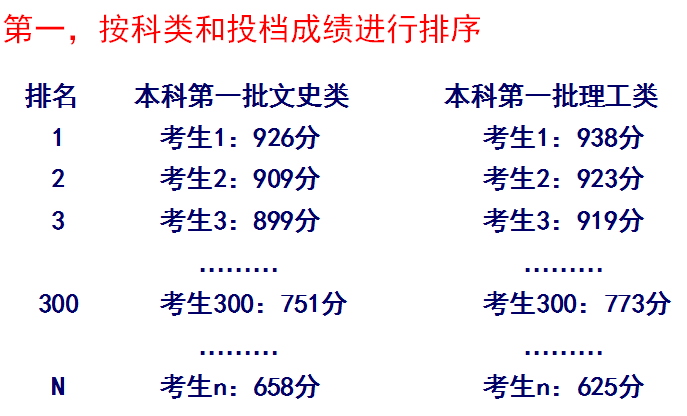 第一,按科类和投档成绩进行排序
