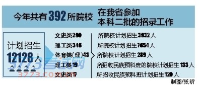 今年共有392所院校在我省参加本科二批的招录工作,计划招生12128人。其中:文史类290所院校计划招生3932人,理工类346所院校计划招生7654人,体育类(理)43所院校计划招生289人,理工类19所招收民族预科班的院校计划招生133人,文史类17所招收民族预科班计划招生120人。