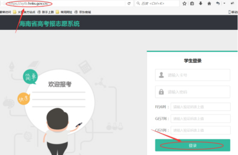 1.打开浏览器后,考生在地址栏输入网址http://www.hnks.gov.cn进入海南省考试局网站,点击海南省2017年普通高校招生志愿模拟演练链接进入志愿填报系统登录界面。
