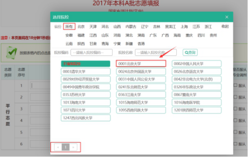 点击院校输入框,在弹出院校选择界面点击“所有”或省份名称,将列出院校名称,点击院校名称,将自动填入该院校志愿。
