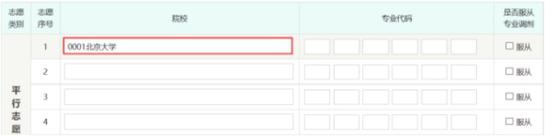 选择院校后,点击专业代码输入框,系统会弹出专业选择框,点击专业名称,自动选择该专业,按此方法依次填报其它专业志愿。