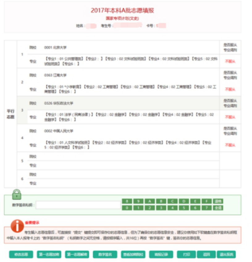 三、考生应在规定时间内参加网上填报志愿模拟演练,否则视为自动放弃。演练期间,任何人不得代替考生进行网上填报志愿。为确保考生信息安全,考生要妥善保管好自己的报考卡信息,不要泄露给他人。考生填报志愿结束后,应使用“退出系统”功能退出网上志愿填报系统。