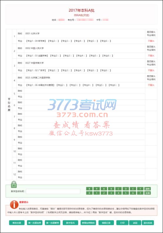 若需要对第一志愿进行加密,考生要在数字签名私钥编辑框中输入报考卡上的数字签名私钥,点击“第一志愿加密”按钮,若加密成功,会弹出信息框“第一志愿加密成功”,表示第一志愿已经加密。