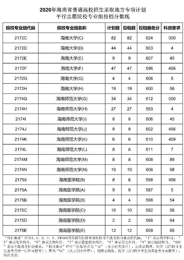 2020年海南省普通高校招生录取地方专项计划平行志愿院校专业组投档分数线
