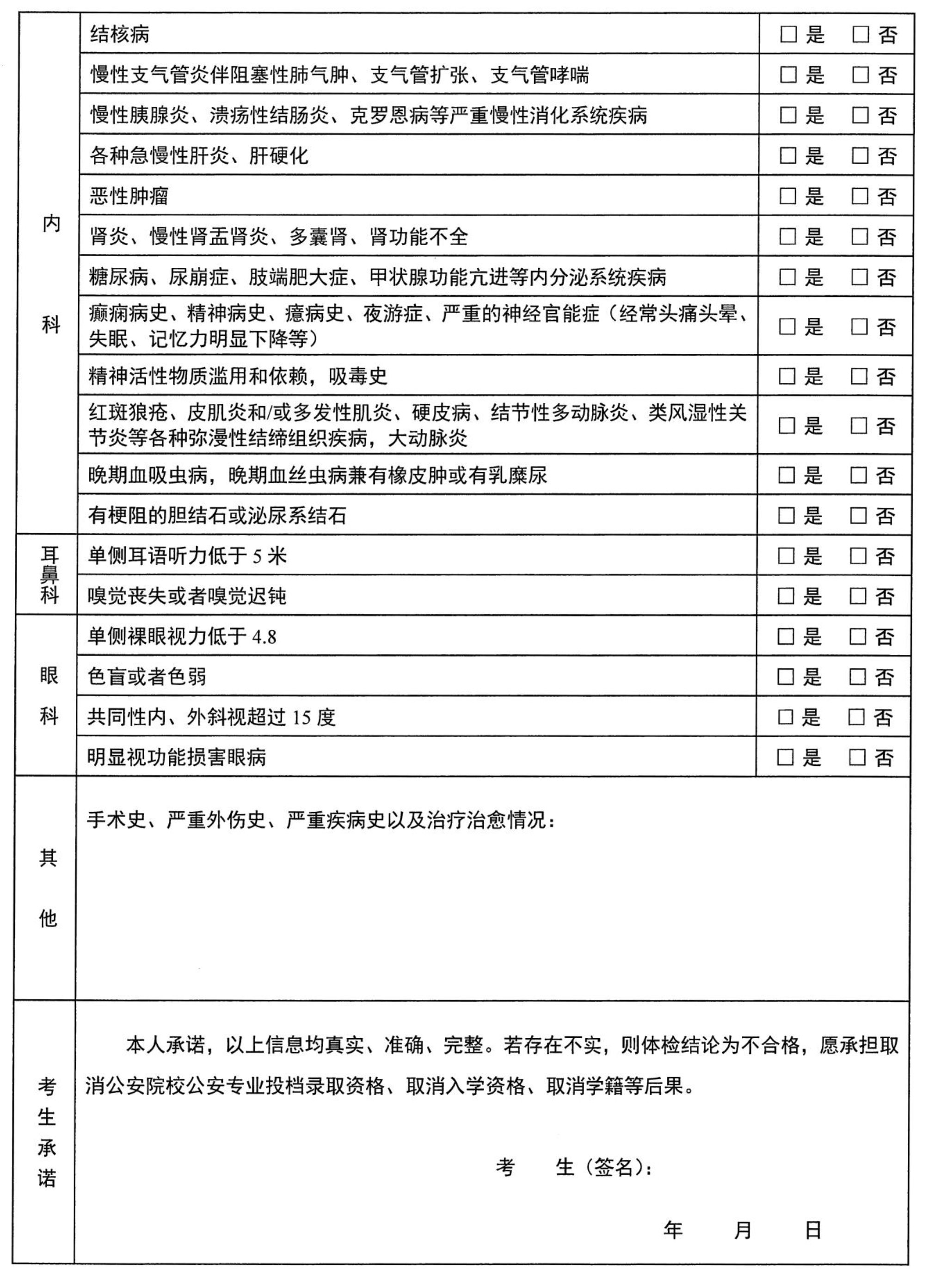 6.考生本人还须现场签名承诺未通过服用药物、使用器械等手段(如服用降压药物、佩戴角膜塑形镜、使用拉伸增高器械等)弄虚作假,干扰体检结果,并填写《公安院校公安专业本专科招生患病经历申报表》(附后),申报患病经历和手术史、严重外伤史、严重疾病史及其治疗治愈等情况。考生务必认真阅读、逐项核实确认,确保如实承诺,考生对其真实、准确、完整性负全部责任,若有不实,则体检结论不合格,由考生自行承担取消公安院校公安专业投档录取资格、取消入学资格、取消学籍等后果。