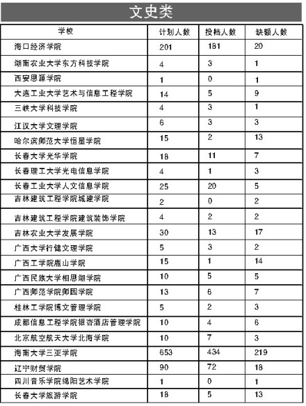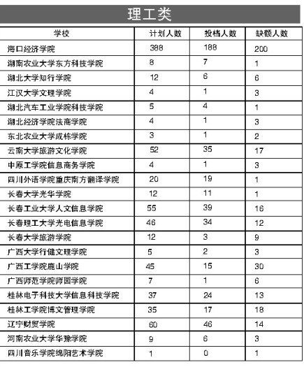本报海口8月3日讯(记者马春华)经过两轮模拟投档后,本次投档中仍有部分院校存在缺档,本科第三批文史类缺档24所,理工类缺档22所(见下表)。