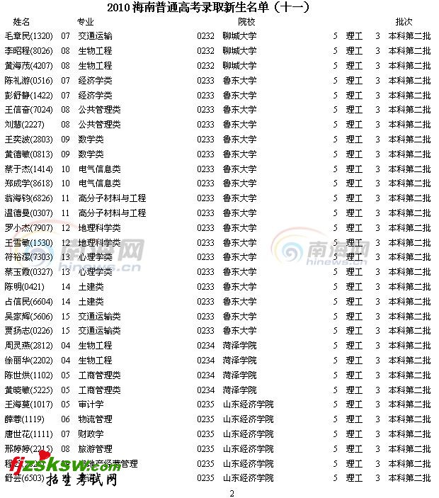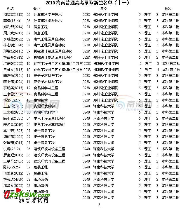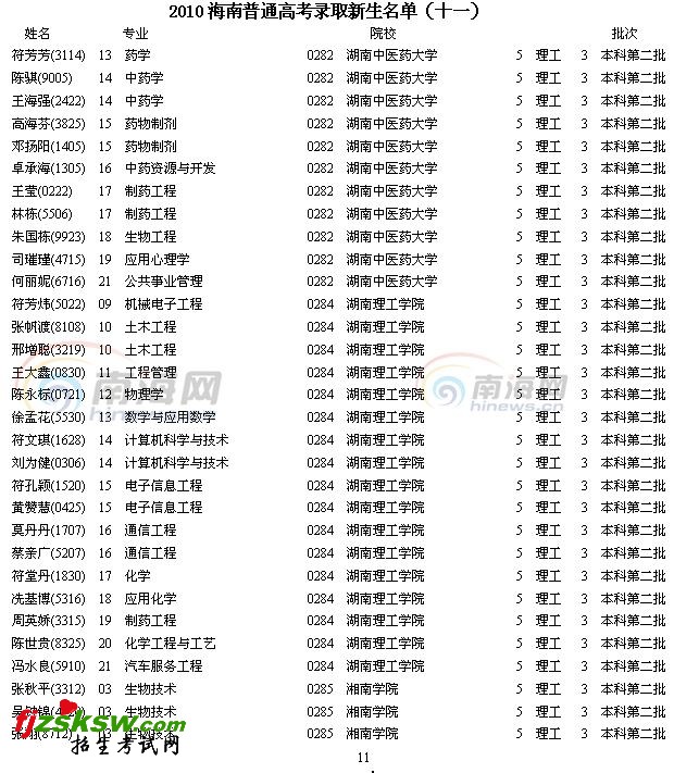 2010年海南普通高考录取新生名单(十一)