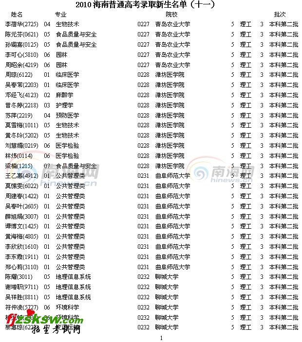 2010年海南省高考录取名单已经开始由海南省考试局陆续公布,今天公布的是2010年海南省普通高考录取新生名单(十一)。