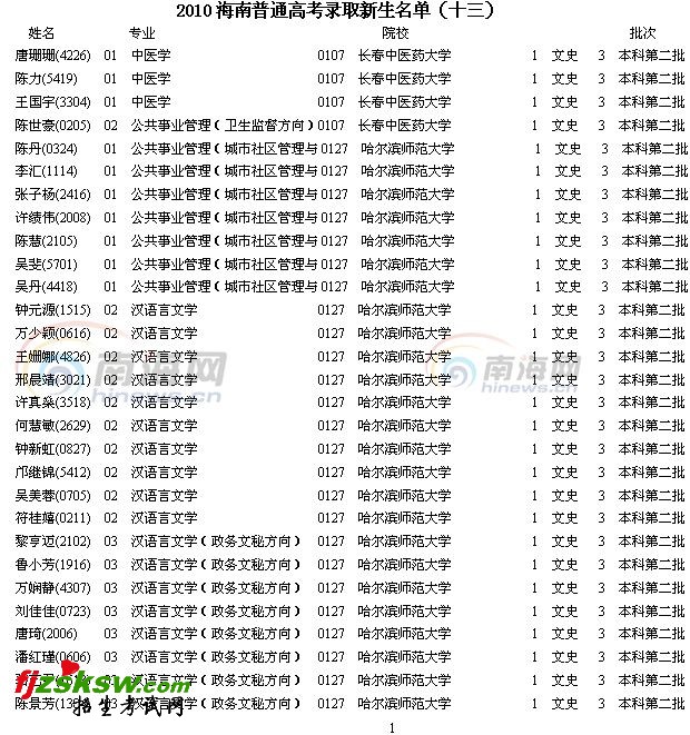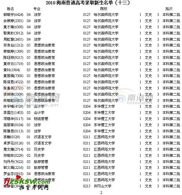 2010年海南高考录取名单查询