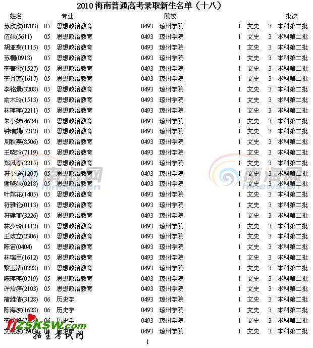 2010年海南省高考录取名单已经开始由海南省考试局陆续公布,今天公布的是2010年海南省普通高考录取新生名单(十八)。